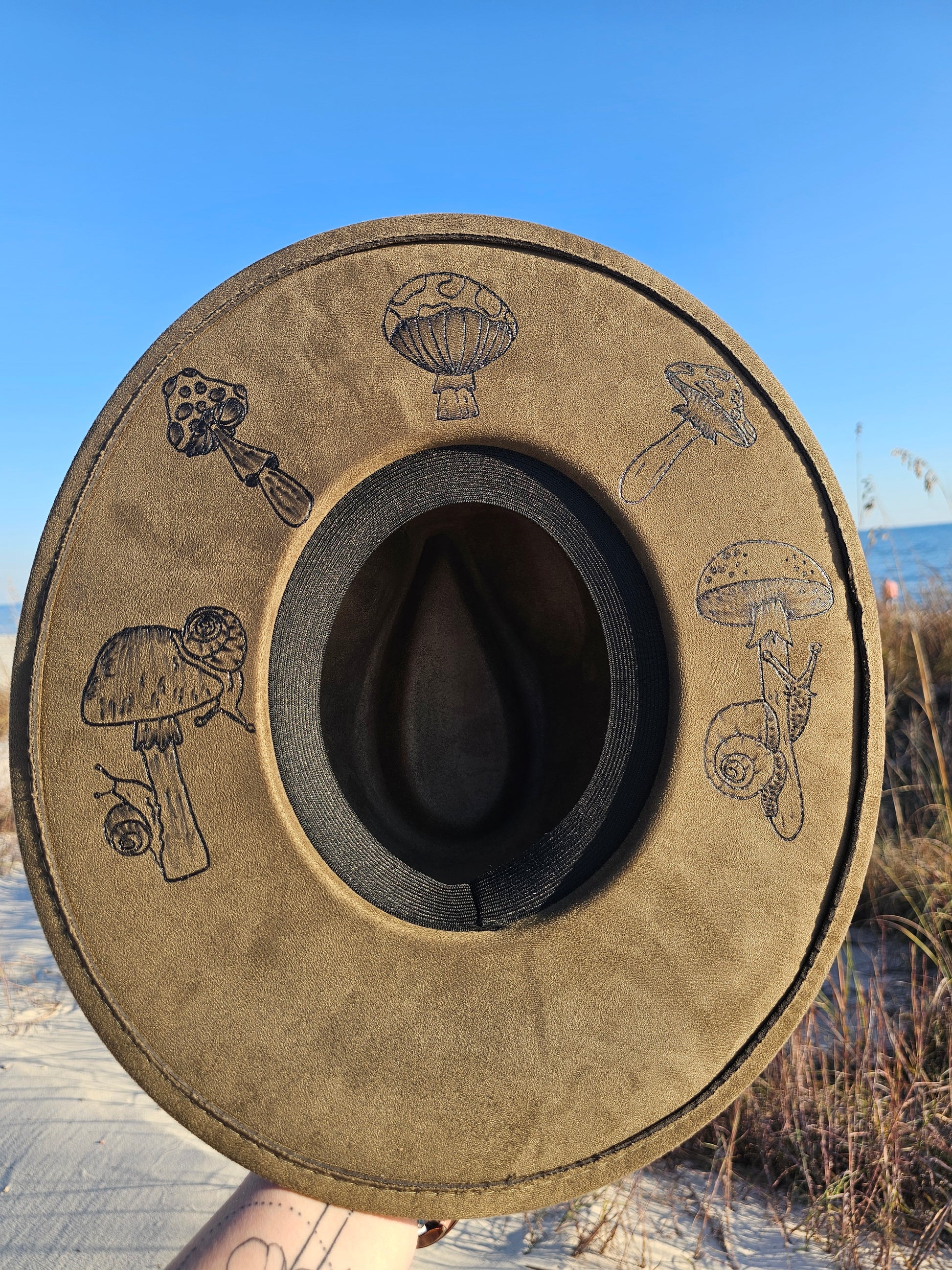 Whimsical Woodland is a nature-loving dream come to life. This earthy vegan suede hat is hand-burned with playful mushrooms, drifting snails, and a floating hot-air balloon — creating a soft, storybook aesthetic all the way around the brim. Lightweight, magical, and completely one of a kind, it’s perfect for forest wanderers, cottagecore lovers, and anyone who adores a touch of whimsy in their style. **Elastic Band. One size.